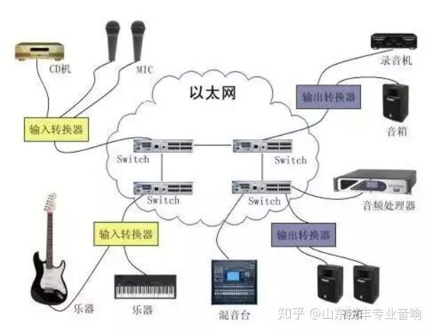 DANTE可以任由音频信号在以太网中使用TCP/IP方式任意传送,而且在这个过程中能保持信号的精确还原。下面的图一反应了DANTE网络的连接工作方式:
