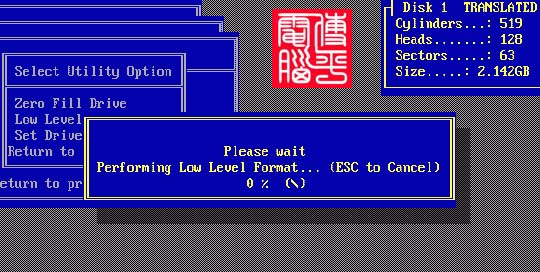 选择完毕,就开始硬盘低级格式化的操作,其中用百分比显示进度。
